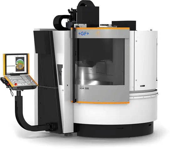 The MIKRON HSM500 HSCI is based on a fixed portal design. The X-axis is on the base of the machine; the Y- axis and Z-axis are mounted on the portal. This design minimizes the total floor space required by the machine and is very well suited for the production of high value components such as molds, electrodes and production parts especially in the range of 3-D.