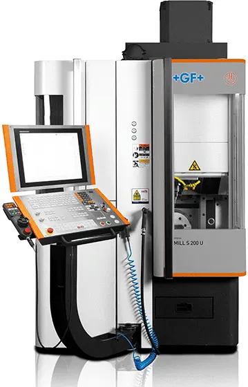 The MILL S 200 U is a real high speed machining center - extremely fast and precise. For optimal dynamical stiffness and absorption of machining and dynamically generated mass energy, the axis design is extremely rigid and powerful. A polymer concrete base is supporting weight optimized and highly stiff cast iron sliding carriages. All axes are powered by direct motor drives to enable fully simultaneous high-speed machining. The linear axes are supported by linear-roller-guide ways of impressive size. The result is outstanding product quality and short processing times and best return on invested money.