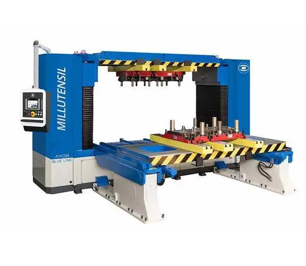 The AM 06 is the first model with an hydraulic system controlled by electronic servo proportional valves and a control of parallelism. The control system includes measurement devices. They are integrated in the brushless engines and continuously check the die splitter upper plate position and parallelism compared to the lower plate. The die-splitter is monitored through Siemens PLC commanded by Touch Panel.