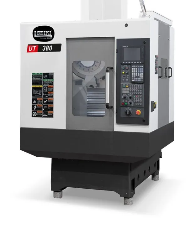 The UT-380 is the fastest CNC milling and tapping center in its class and is also well suited to high volume machining as well high speed 3D machining. This machine will exceed the demands of any manufacturer with high volume, high precision machining needs. The compact size consumes very little valuable floor space while the blazing speed will deliver more parts per hour than the competition. The machine is a fixed column / moving table type design.