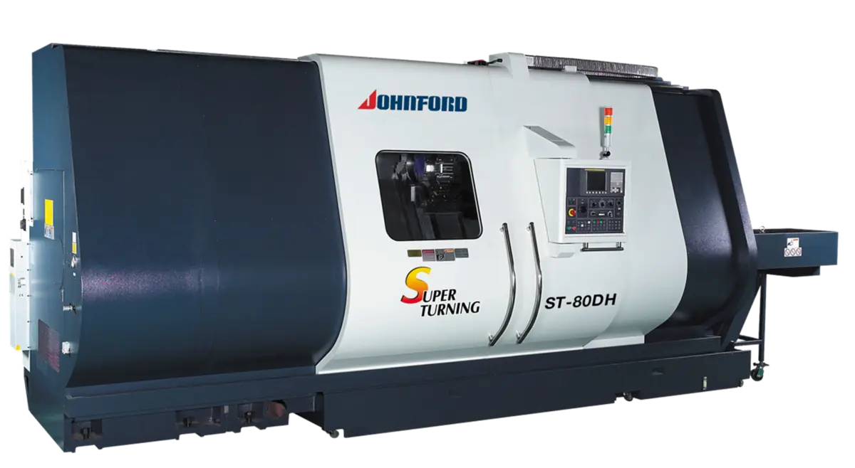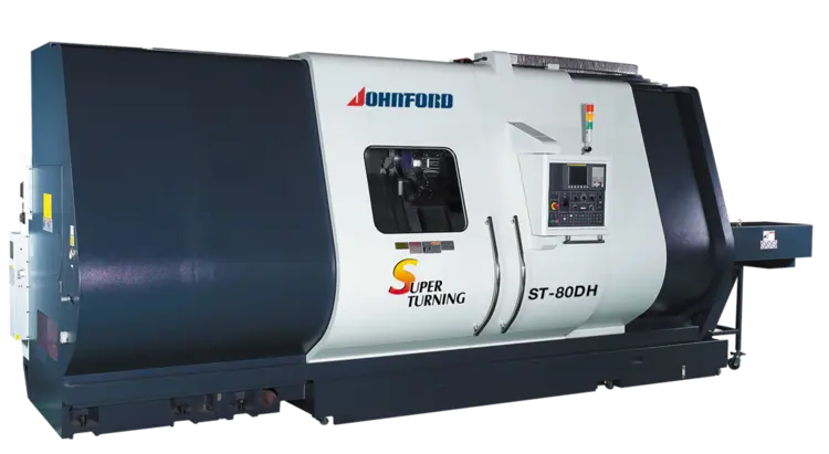 The Johnford ST-80DH is a heavy duty, high precision CNC turning center cast from Meehanite iron. Full advantage of the 50HP (60HP optional) spindle motor and 4 speed gear box is taken by the massive one piece, 60 degree slant bed design. Built in classic style, the 60 degree slant bed is a torque tube design. The torque tube, or hole cast through the center of the slant bed, provides an extremely rigid bed and excellent heat dissipation. The square box ways provide the rigidity for heavy duty turning. Hand scraped Turcite - B applied to all mating sliding surfaces ensures high rapid traverse rates and accurate positioning. To ensure precision and thermal stability the headstock, tailstock, and saddle are all mounted on the same plane at a 60 degree angle. The coolant tank is separate from the machine base to prevent heat transfer from the coolant to the machine casting which ensures precision and promotes easy clean out and maintenance. To further ensure accuracy and precision, the ballscrews are double nut type and pretensioned to eliminate thermal growth.