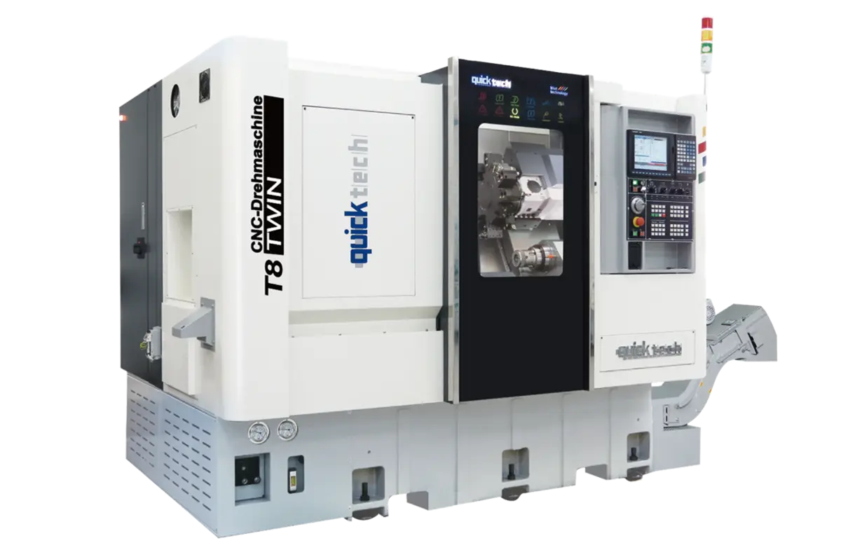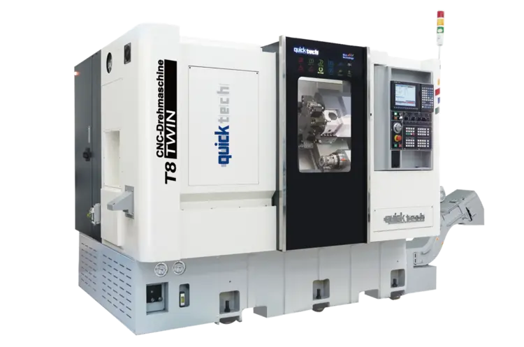 The QuickTECH T8 TWIN Y combines a powerful 2.5” bar capacity main spindle utilizing a 3 axis BMT-55 power turret with a sub spindle. This, high production CNC turning center is cast from Meehanite iron. With a 65mm bar capacity, this unique bar processing center provides complete part machining including complex milling functions. The T8 TWIN features 6 total axes, 2 turning spindles, 1 live milling turret, and a minimum capacity of 12 tools. .
