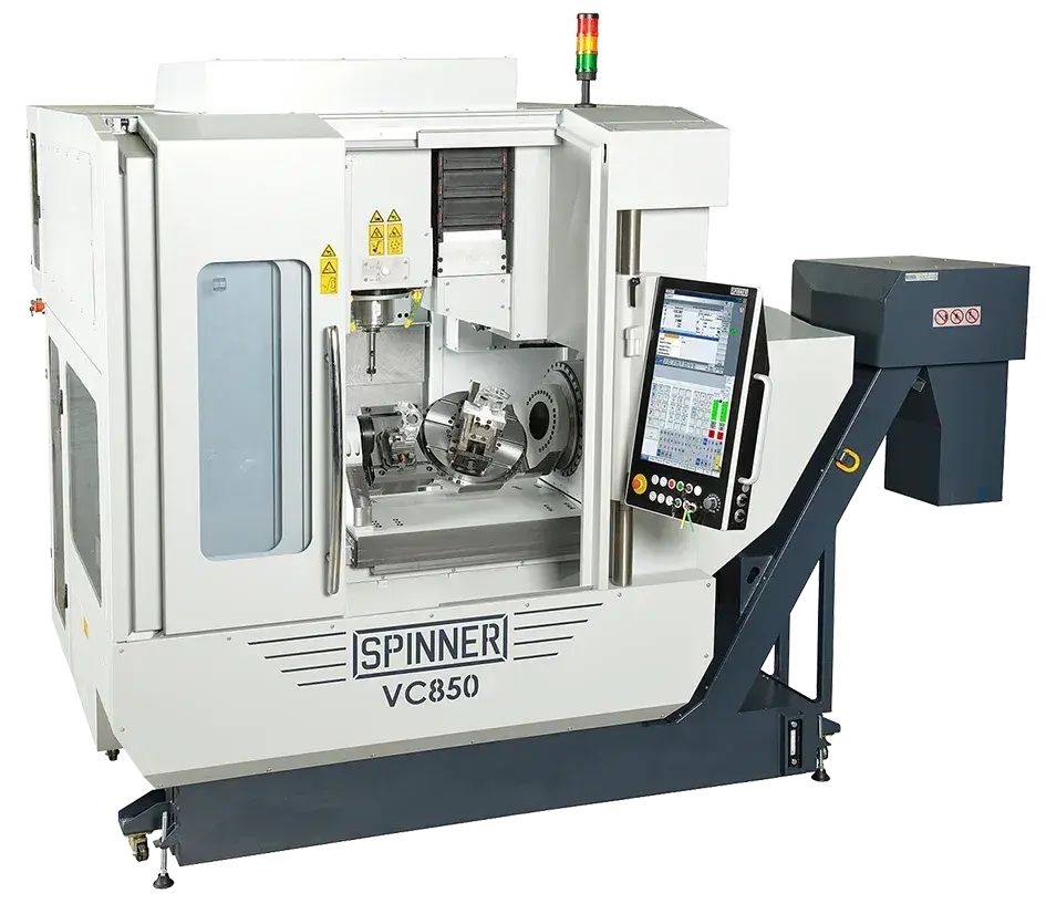 The VC850-5A is a 5-axis Vertical Machining Center for high performance 3+2 and 5-axis simultaneous machining with spindle speeds up to 18,000 rpm. This machine has an integrated rotary-/swivel table that is perfect for workpieces up to about 350mm on rotary table and accommodates parts of many different sizes and materials. It is available with the most modern controls such as Heidenhain and Siemens.